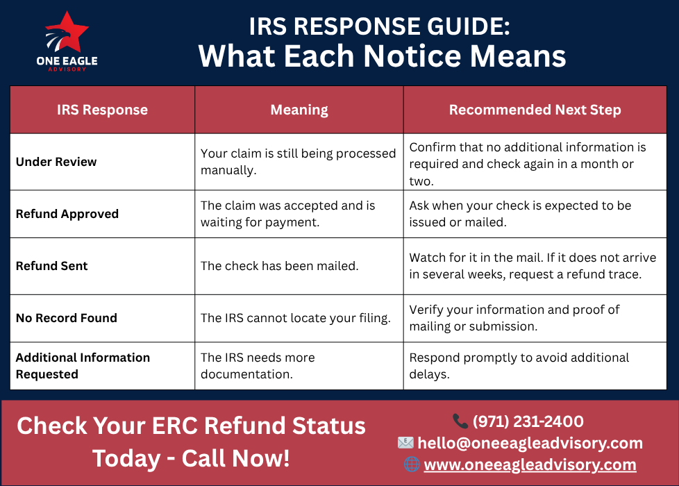 At One Eagle Advisory, we help business owners understand what is happening with their ERC claims. CPA’s and Tax Attorneys communicate with IRS business channels and can interpret the information you receive about your ERC refund status.